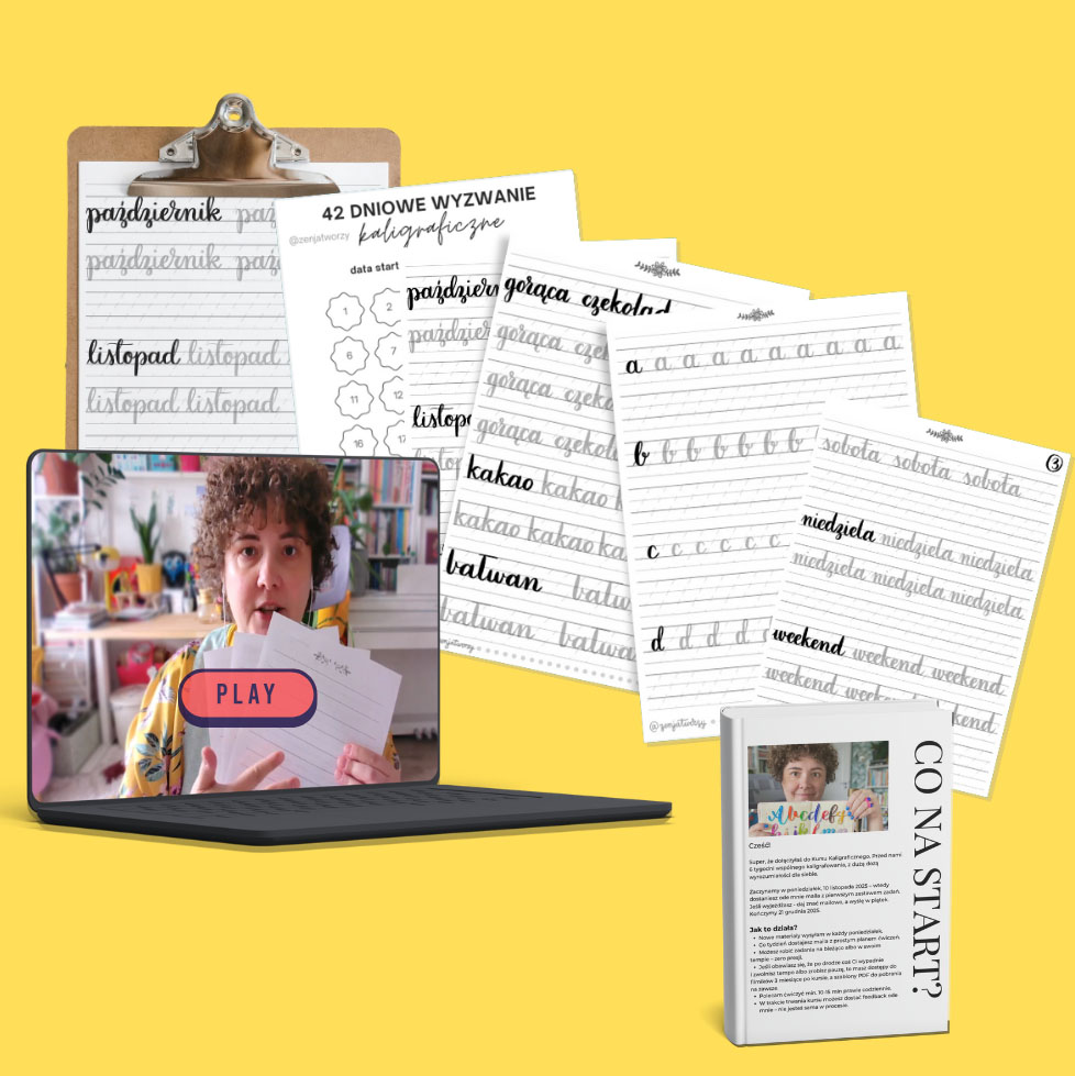 Wystarczy ok. 15 minut dziennie. To ma być coś, co da się zrobić po pracy, bez reorganizacji życia i bez poczucia, że “znowu nie dowiozłam”. Działamy w trybie cotygodniowym, lecz możesz wybrać własne tempo i jeśli musisz zrobić przerwę, to ok. Arkusze do kaligrafii wystarczy zapisać na dysku i masz je na własność, więc możesz później do nich wrócić.
